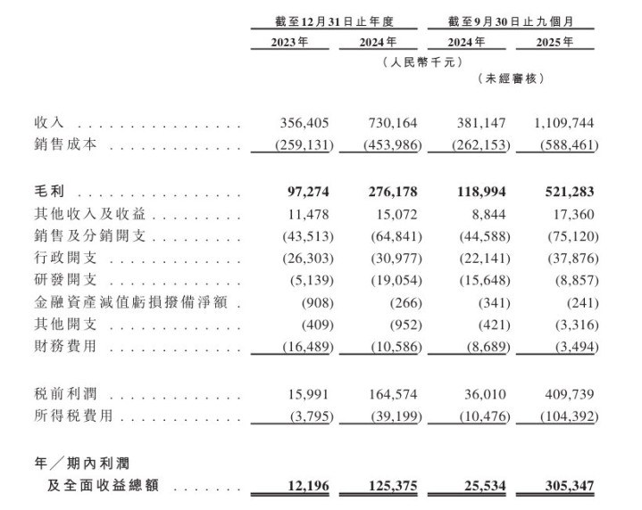 公司于2023年、2024年、2025年截至9月30日止九个月,年/期内利润分别约为1219.6万元、1.25亿元、3.05亿元人民币。