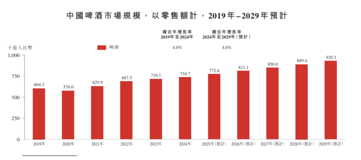 以零售额计,中国啤酒市场规模已从2019年的人民币6,043亿元增长至2024年的人民币7,347亿元,复合年增长率为4.0%。预计未来五年将延续稳健增长趋势,至2029年市场规模将达人民币9,293亿元,2024年至2029年复合年增长率进一步提升至4.8%。