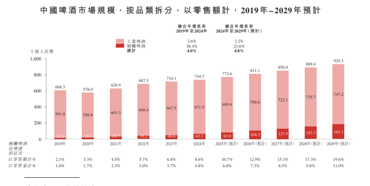 以零售额计,精酿啤酒市场规模由2019年的人民币125亿元增长至2024年的人民币632亿元,复合年增长率达38.4%。预计2024年至2029年仍将保持快速扩张,年均复合增长率达23.6%,市场规模有望于2029年达到人民币1,821亿元。